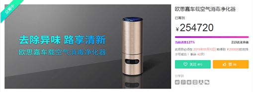 近日,欧思嘉品牌在京东众筹上线了一款产品编号为CJ001的车载空气消毒净化器。截至发稿时止,项目已获得213名支持者支持,共筹得资金254720元,项目完成进度达到127%。